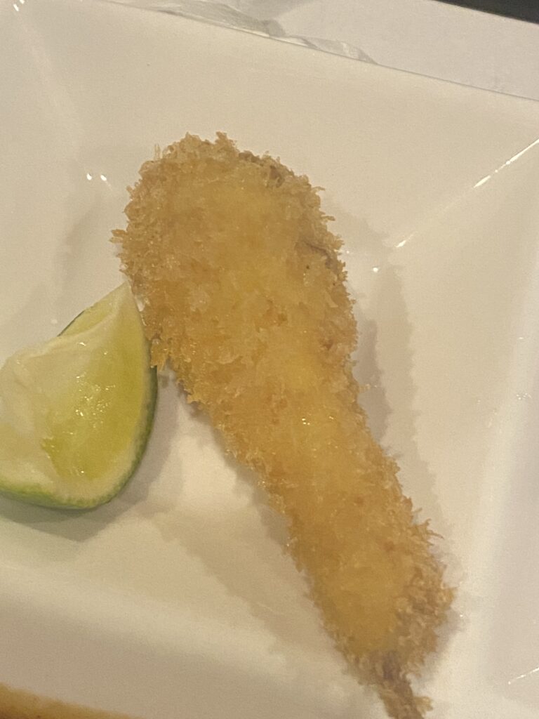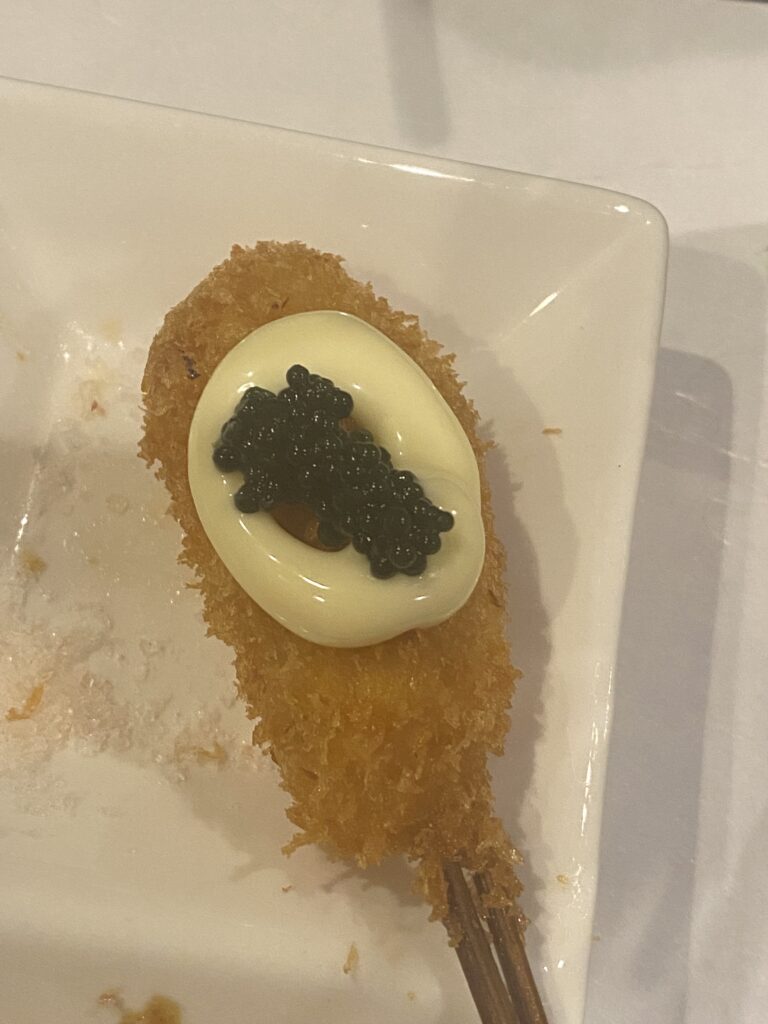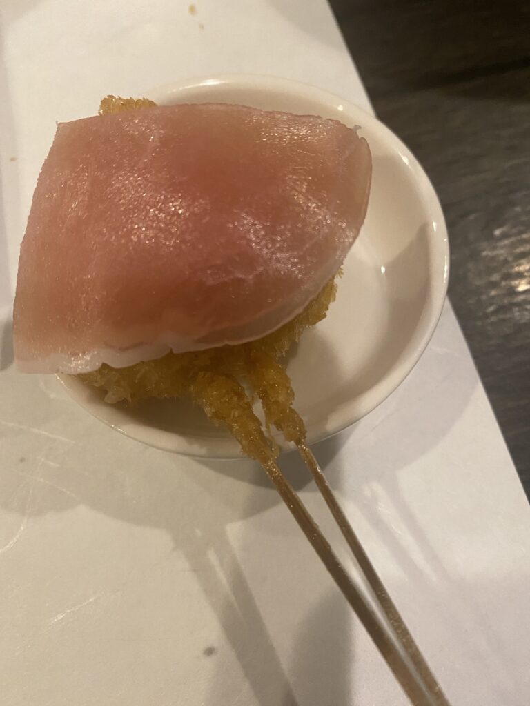 えびの串揚げです。からっと揚げてあり、いくらでも食べられます。隼十さんのお店では油にこだわっていられまして、胃もたれがしない油になっています。